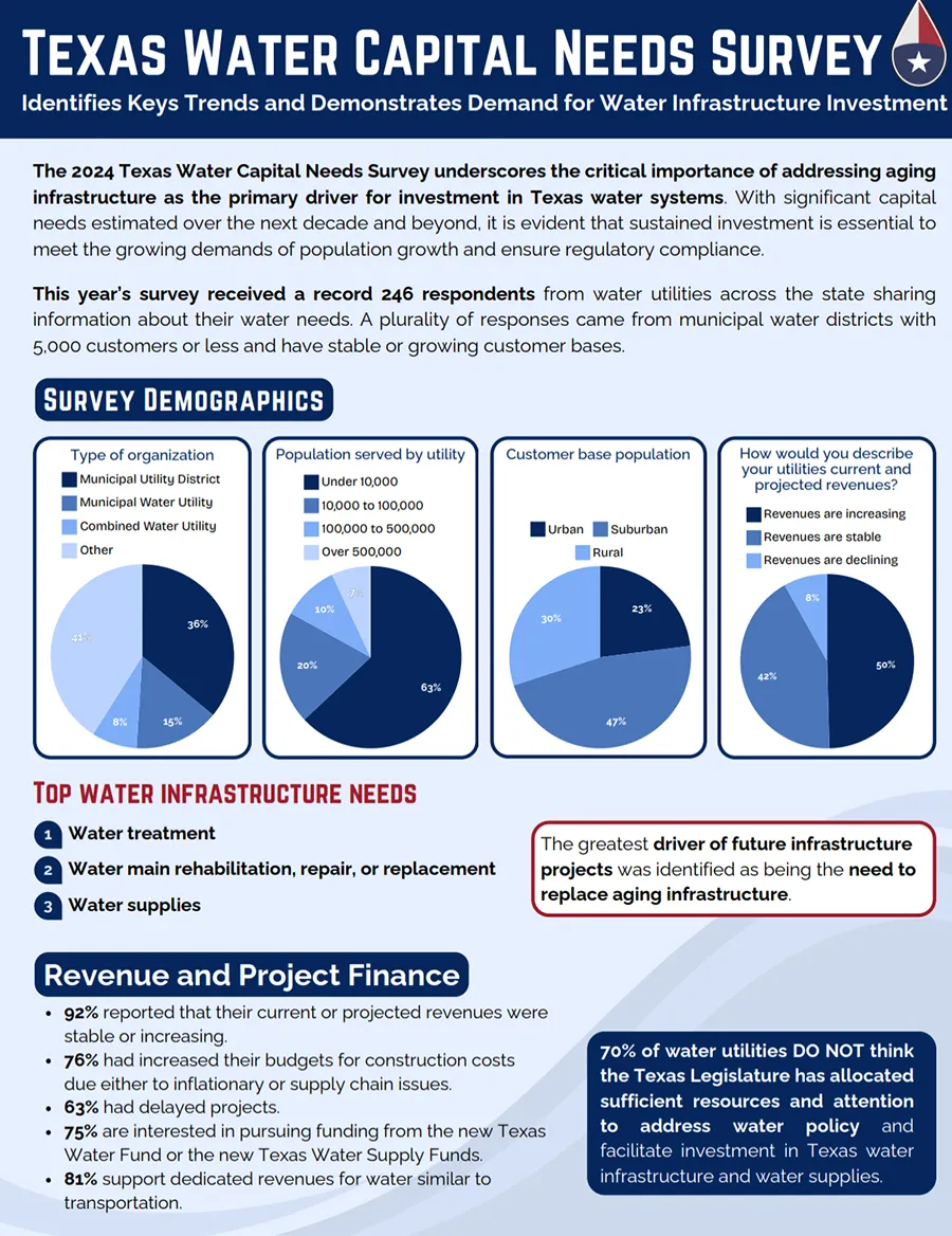 TXWIN produces and supports research that reflects real conditions across Texas water utilities. This includes the annual Texas Water Capital Needs Survey, developed with industry partners and based on input from utilities statewide.